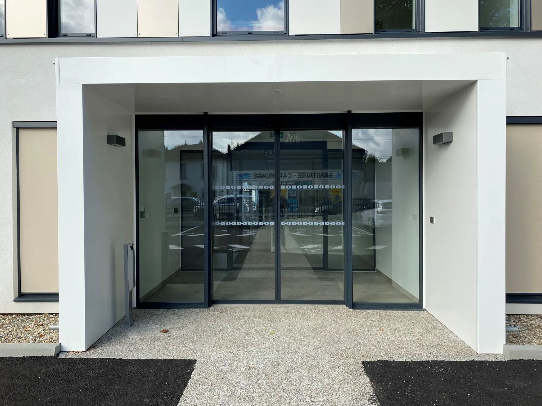 Les prestations ont également inclus la pose de portes métalliques et menuisées, dont des portes techniques et des ensembles vitrés intégrés au hall d’entrée. Ces ouvrages assurent à la fois la sécurité, l’isolation et la fonctionnalité des accès principaux et secondaires du bâtiment.