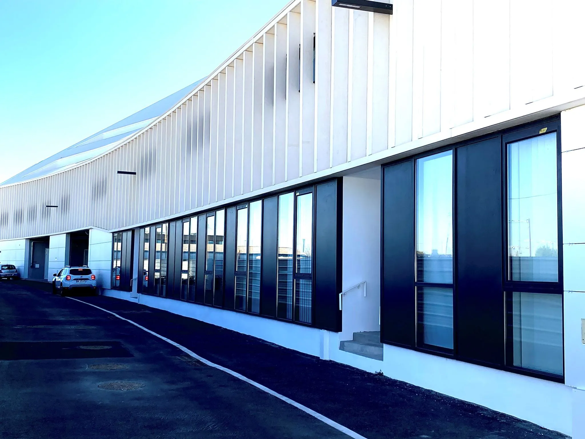 Des portes battantes intégrées aux murs rideaux ont également été réalisées, permettant de concilier transparence, fonctionnalité et sécurité des accès.